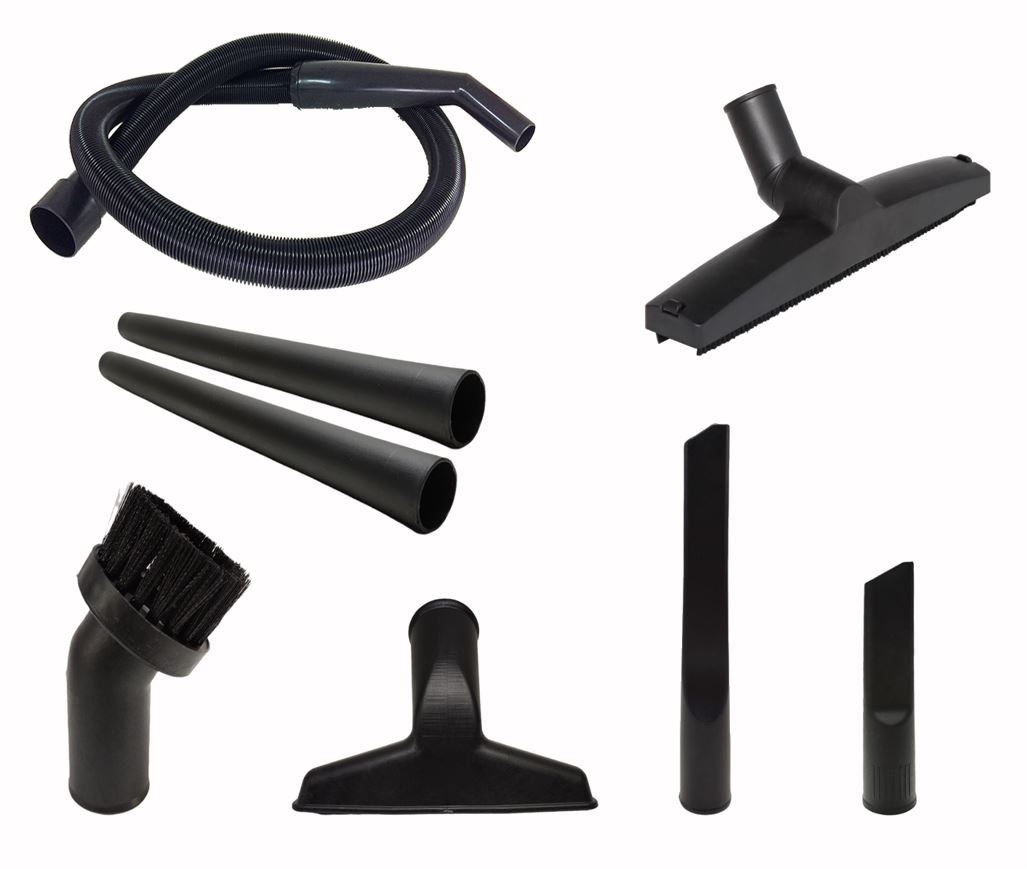 O Kit comtém: 1 Mangueira / 2 Tubos de Extenção / 1 Bico de cantos curto / 1 Bico de cantos Longo / 1 Bocal de Tecido / 1 Bocal de Piso / 1 Bocal de escova redondo